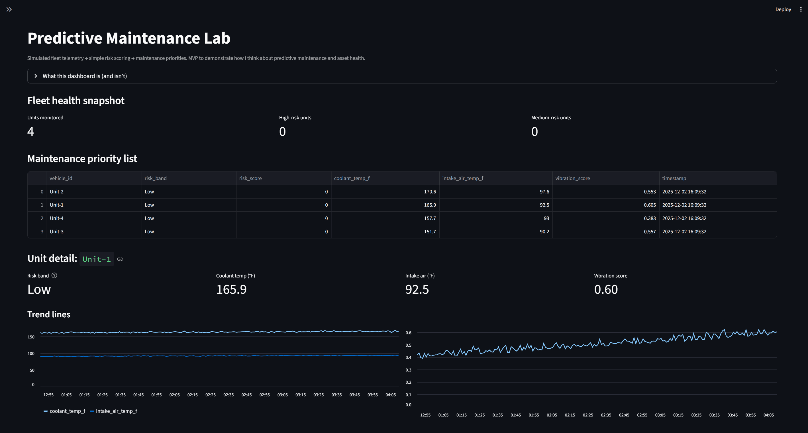 This dashboard consumes simulated fleet telemetry, applies simple maintenance-risk scoring logic, and visualizes the output in a customer-ready interface. Instead of chasing complexity or ML hype, the focus is on clarity: showing the path from signal → risk → action the way a Sales Engineer would explain it in discovery, demos, or value conversations.
