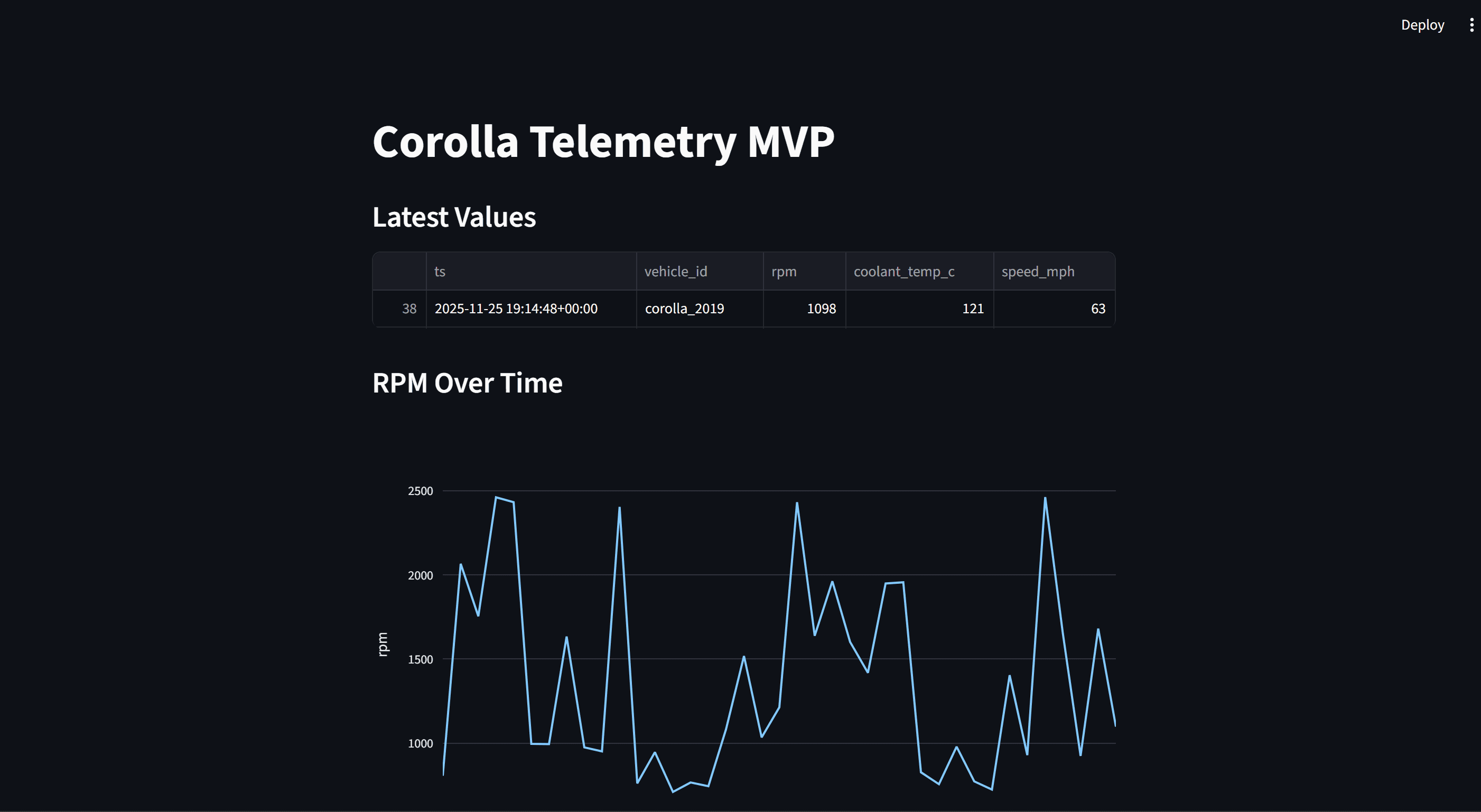 Simulates OBD-II sensor data from a Corolla and streams it into a FastAPI endpoint, then visualizes trends on a dashboard. Useful for time-series reasoning demonstration, and serves as a sensor noise translation into customer facing narratives.